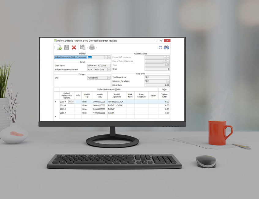 Seçilen ürünlerin dönem sonu envanter kayıtlarını, seçilen masraf faturası, dekontu, girilen tutar ve orana göre artırma ya da azaltma yöntemlerine göre düzenleyebilirsiniz. Masraf faturalarını fiş bazında seçebileceğiniz gibi fatura içerisindeki satırlarından birini ya da bir kaçını seçerek de ürün bazında maliyet düzenleme işlemi yapabilirsiniz.