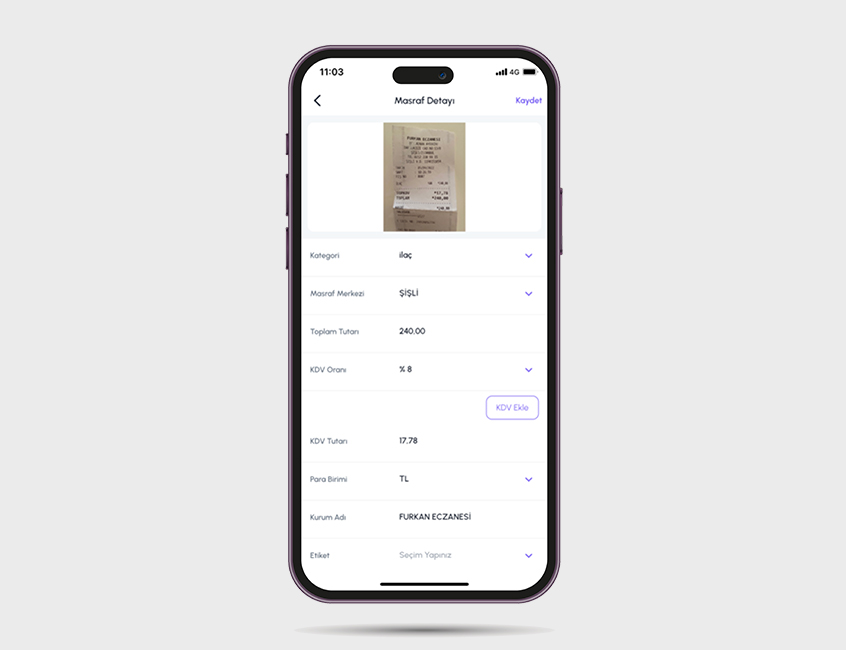 - Masraf fotoğrafını çekerek masrafların yapay zekâ tarafından girilmesini sağlayabilirsiniz